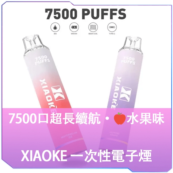 XiaoKe 拋棄式電子煙,8mL 容量,7500 口,650mAh 電池,23 種口味,Type-C 快充。