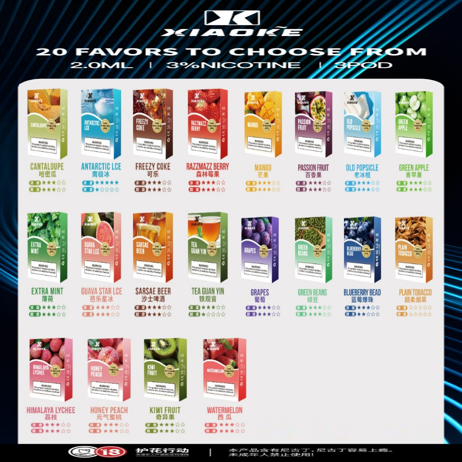 XIAOKE 梟客電子煙煙彈三顆裝,專為一代主機設計,兼容SP2S、LANA、KISS、MEHA等熱門品牌。2.0mL容量,3%尼古丁,陶瓷霧化芯提供順滑煙霧與純正風味,20種口味如哈密瓜、薄荷滿足多樣需求。